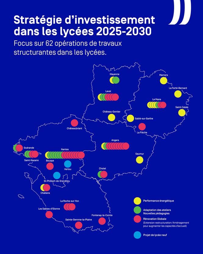 C’est un investissement massif à la hauteur d’une ambition régionale forte pour la jeunesse en Pays de la Loire. C’est le sens de la stratégie d’investissements dans les lycées engagée par la Région. En pratique, ce sont plus de 60 opérations structurantes, de plus de 3M€, programmées pour la période 2025-2030 dans les lycées publics des cinq départements, pour des travaux de rénovation thermique, d’adaptation des locaux aux nouvelles pédagogies et des ateliers aux formations professionnelles, de restructuration de bâtiments existants ou de construction de lycées neufs. En moyenne, la Région programme environ 700 opérations par an.